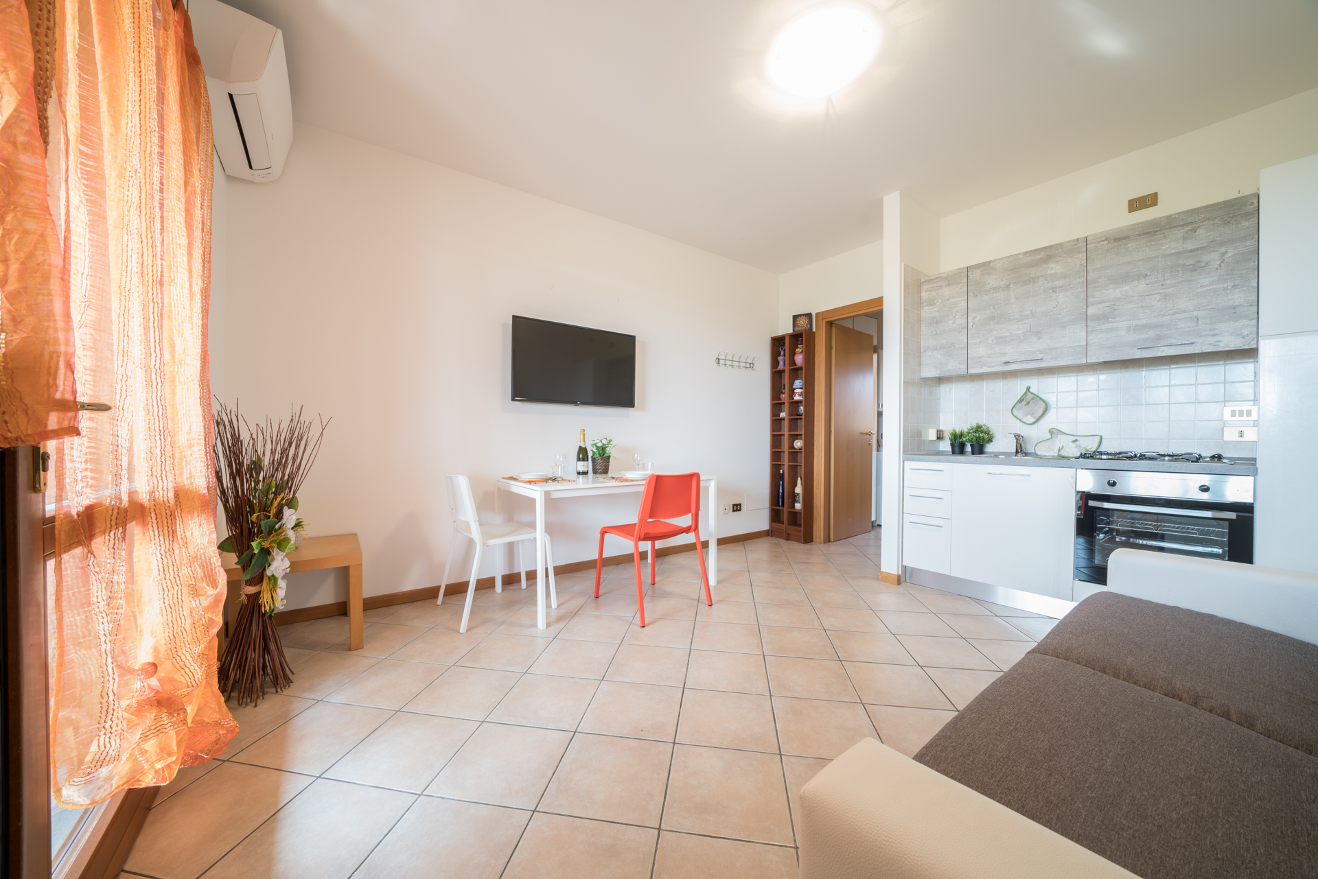 L’appartamento è situato al piano terra, posto auto esclusivo gratuito, due grandi camere da letto matrimoniali, un bagno, una cucina con soggiorno con divano letto matrimoniale, un portico con giardino annesso.